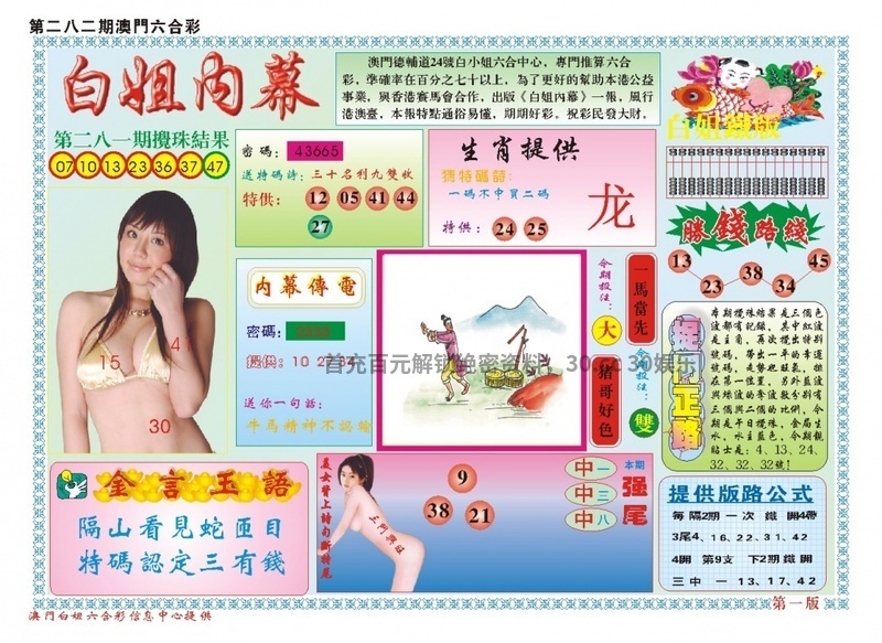 283期《白姐九肖》 综合九肖♘:鼠龙猪鸡猴马蛇兔虎 综合七肖♘:鼠龙猪鸡猴马蛇 综合五肖♘:鼠龙猪鸡猴 主攻特码♘:30.42.14.26.31.43.33.45.10.34 ![]() |